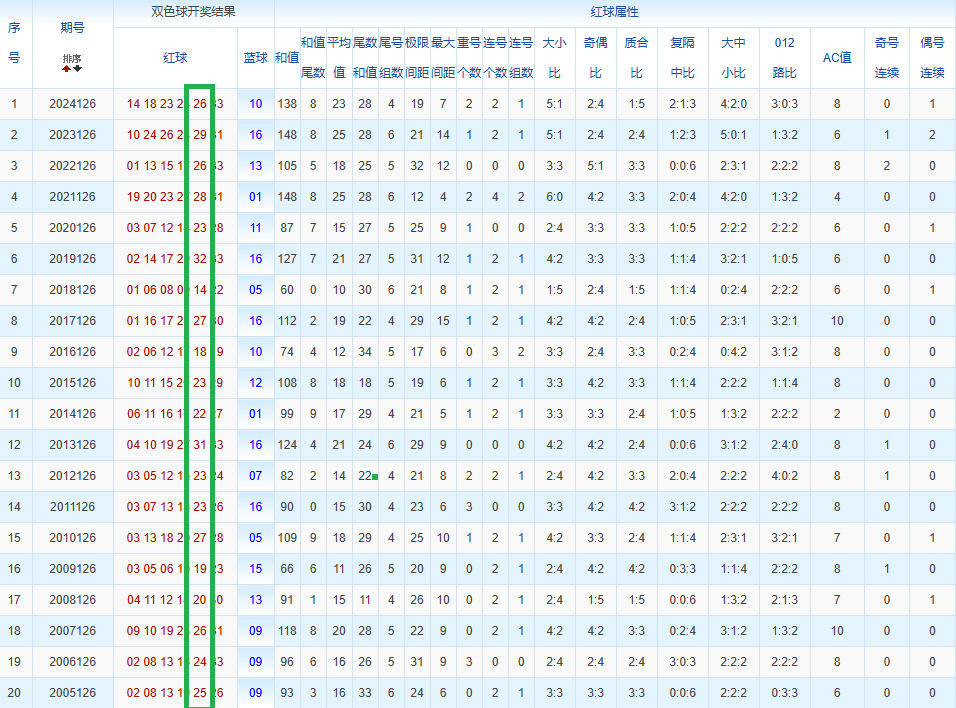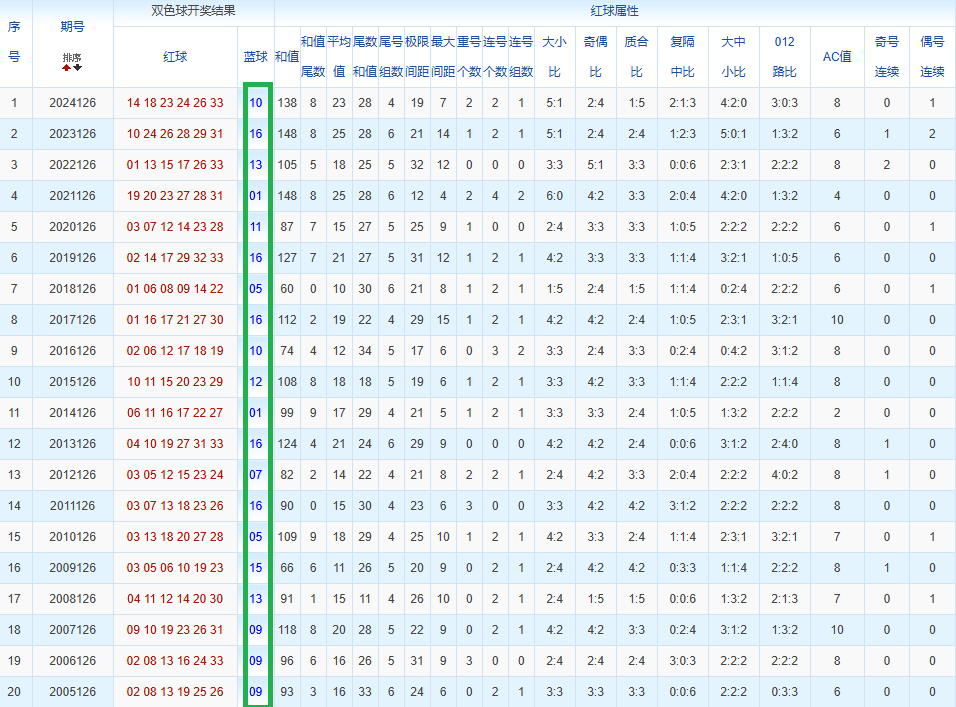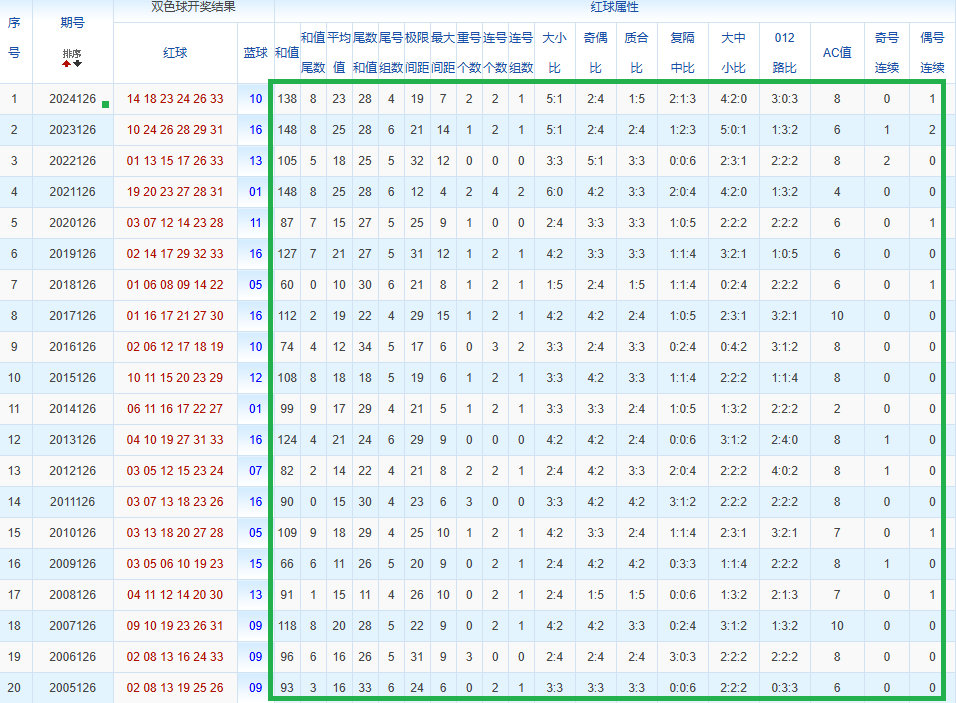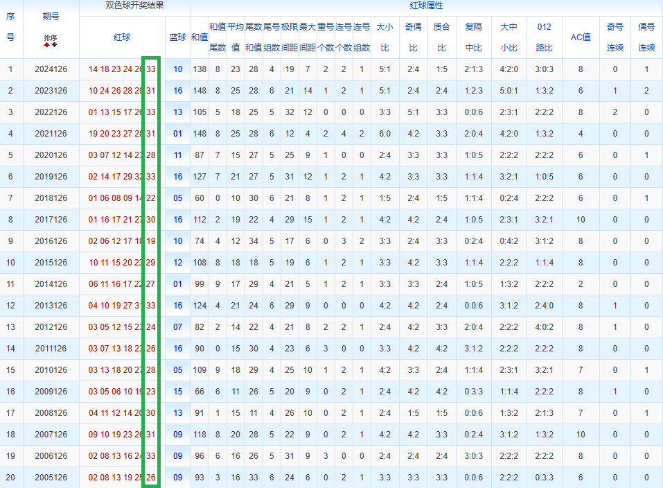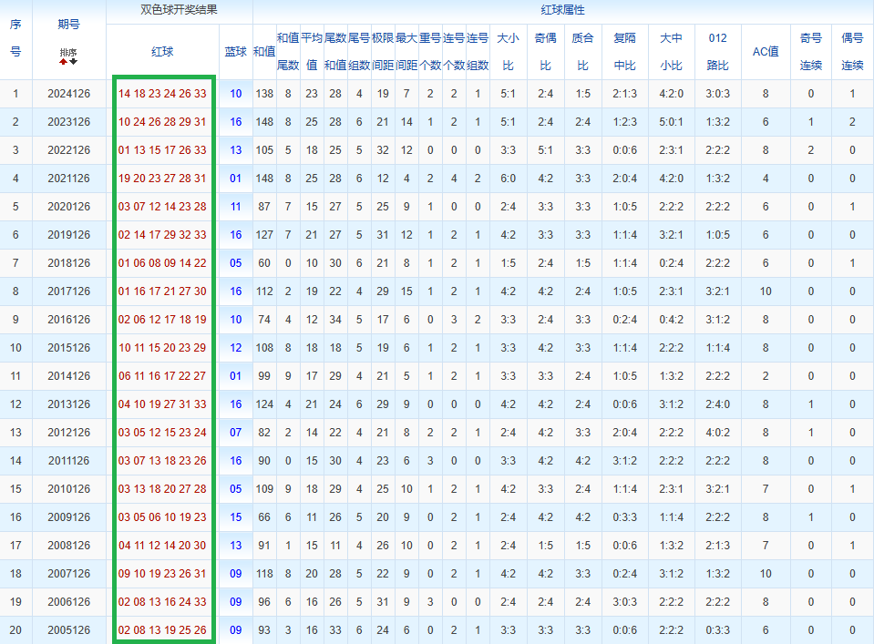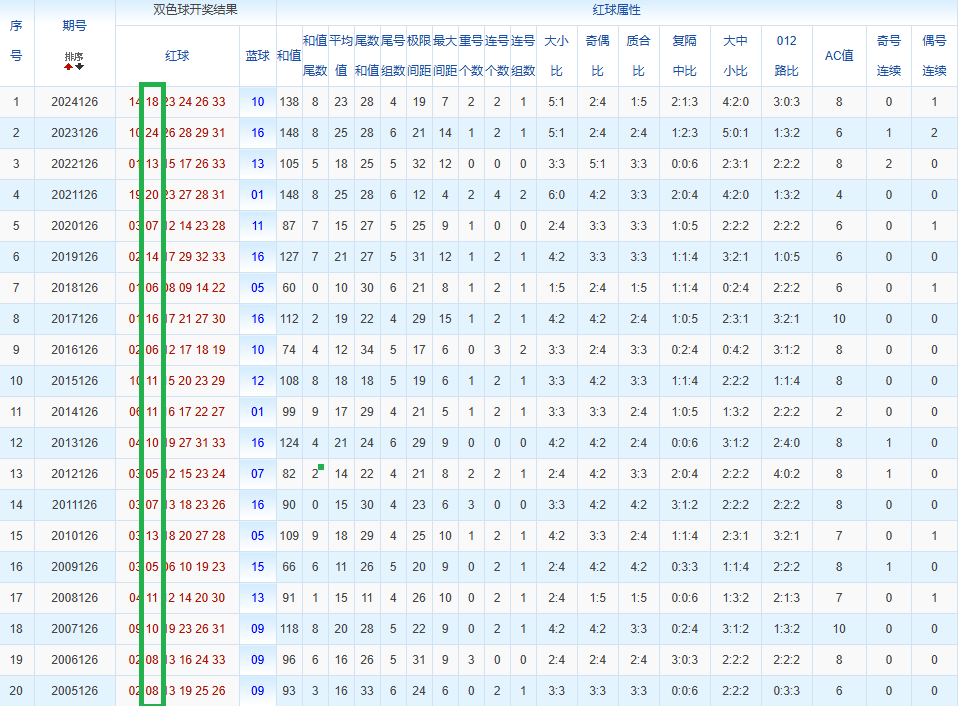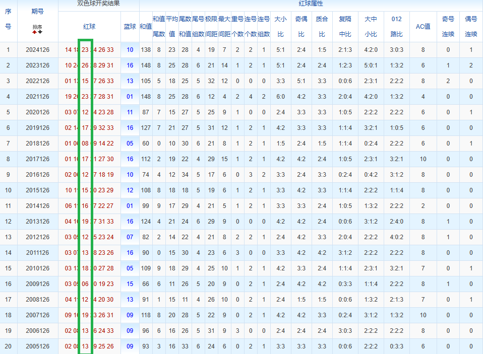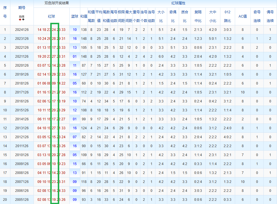 通过观察,我发现双色球往年同期的开奖数据与本期号码之间存在显著关联。具体来说,在红球中,从第一位至第六位,通常会有约4个位置上的数字与往年同期相同位置的号码一致;而蓝球号码中,也有多期开奖结果直接包含了往年同期的数字。因此,我们可以借助往年同期各位置上的号码,作为分析本期开奖情况的重要依据。在此基础上,还可结合往年同期的其他相关条件,进行综合性的号码组合推荐。
