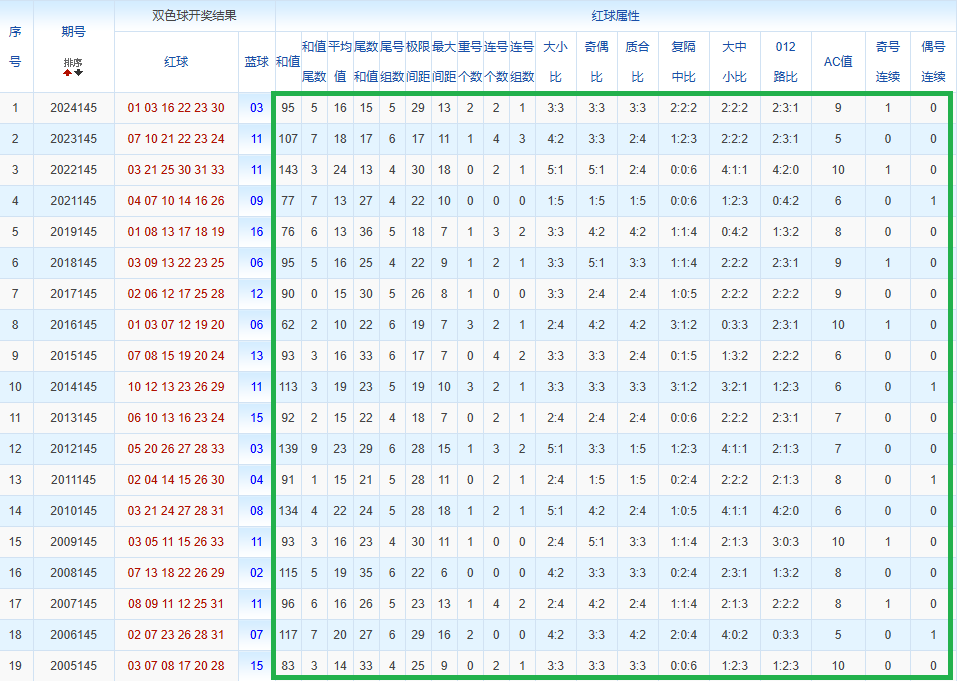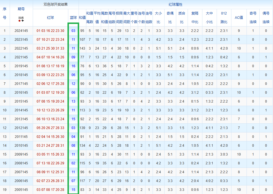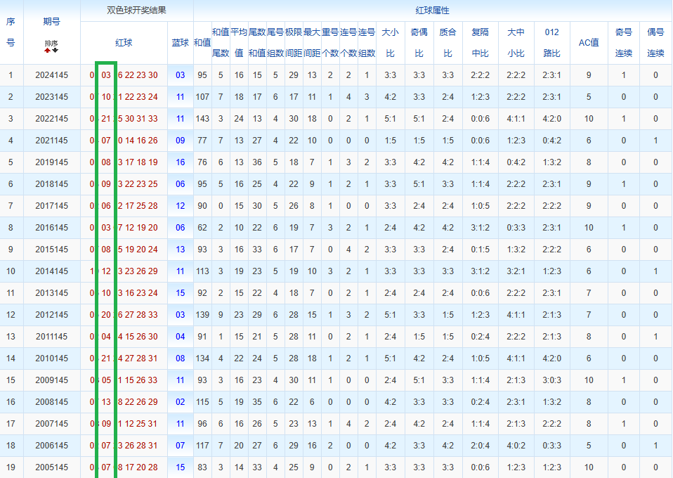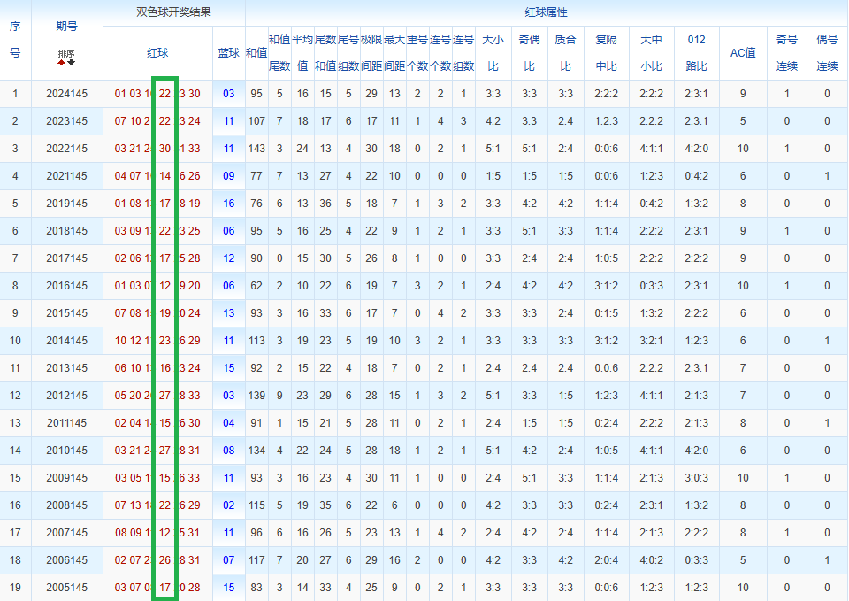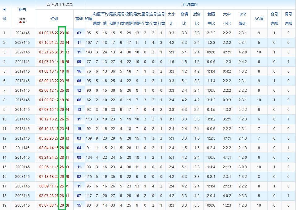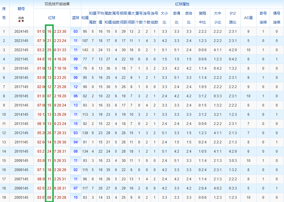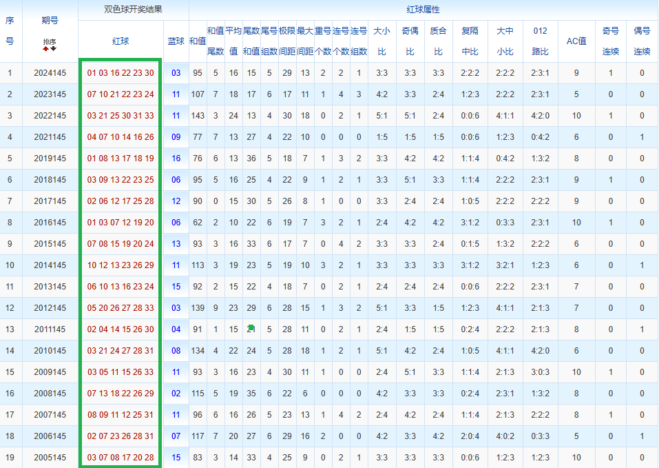 通过观察,我发现双色球往年同期的开奖数据与本期号码之间存在显著关联。具体来说,在红球中,从第一位至第六位,通常会有约4个位置上的数字与往年同期相同位置的号码一致;而蓝球号码中,也有多期开奖结果直接包含了往年同期的数字。因此,我们可以借助往年同期各位置上的号码,作为分析本期开奖情况的重要依据。在此基础上,还可结合往年同期的其他相关条件,进行综合性的号码组合推荐。