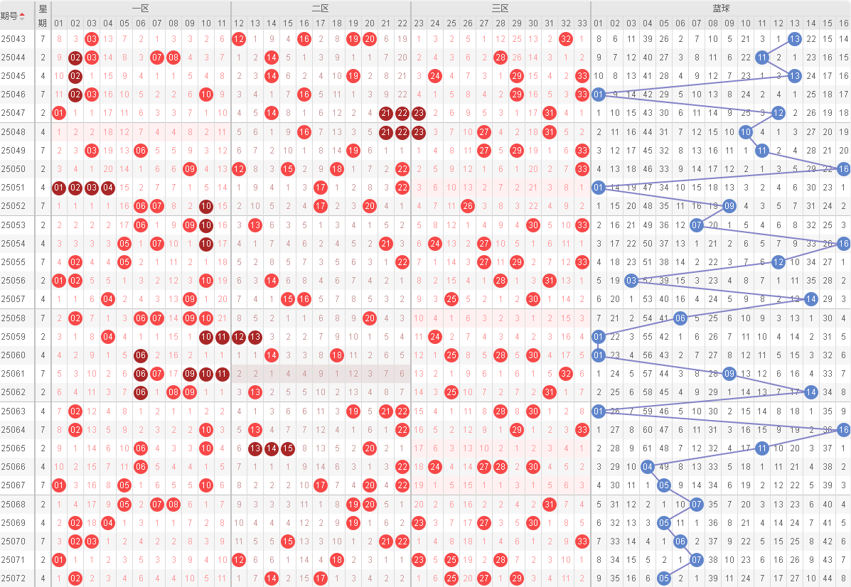 双色球蓝球热号:05 (3次)、07(2次)由于蓝色号码较少,冷号不具有参考意义,不再列出。