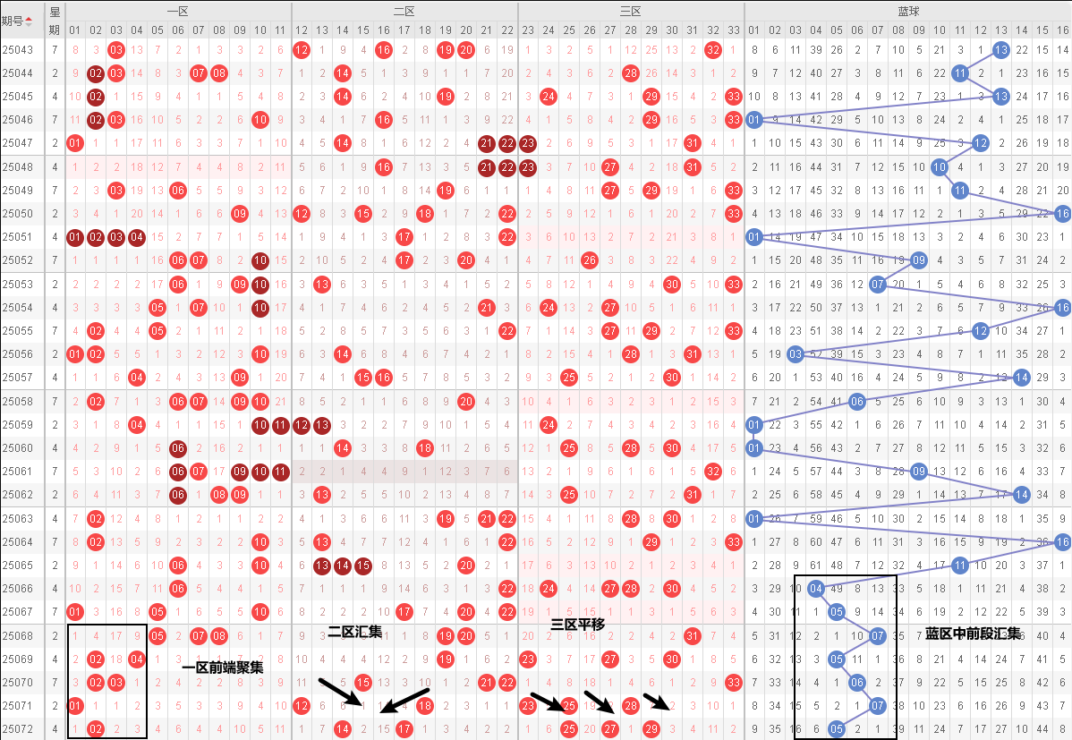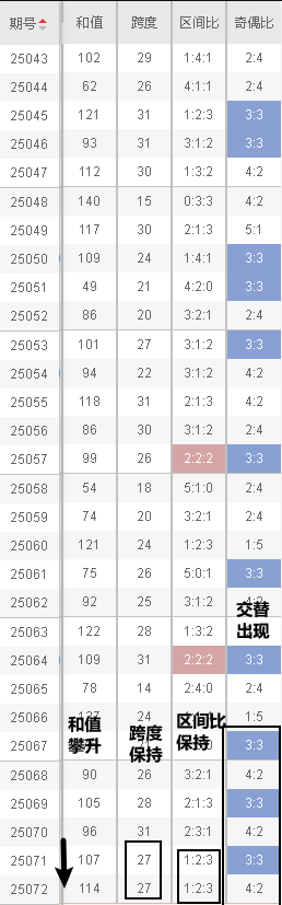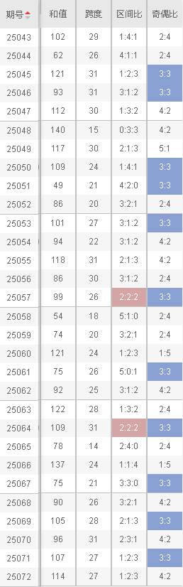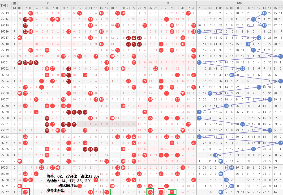 双色球第25072期选号分析基于我们前面列出来的最近十期的历史数据以及基本走势,接下来我们依然按照冷热号、和值、奇偶比、跨度、区间比等多维度进行综合分析。