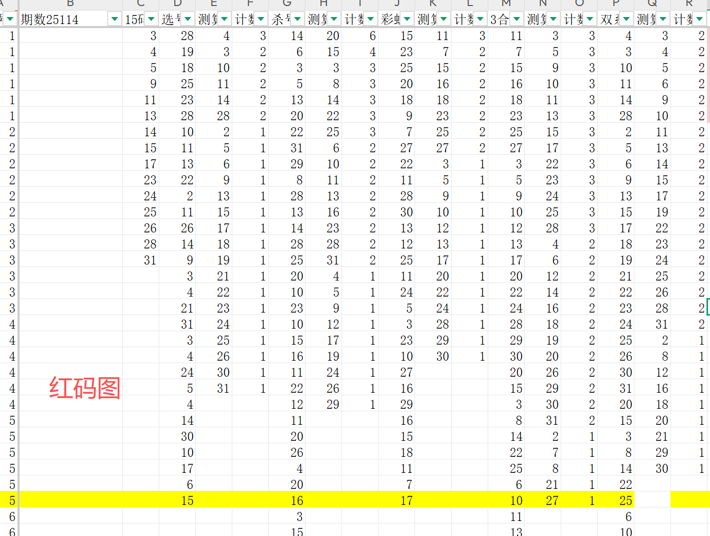 得出一组红码数据就是:3 4 5 9 11 13 14 15 17 23 24 25 26 28 31