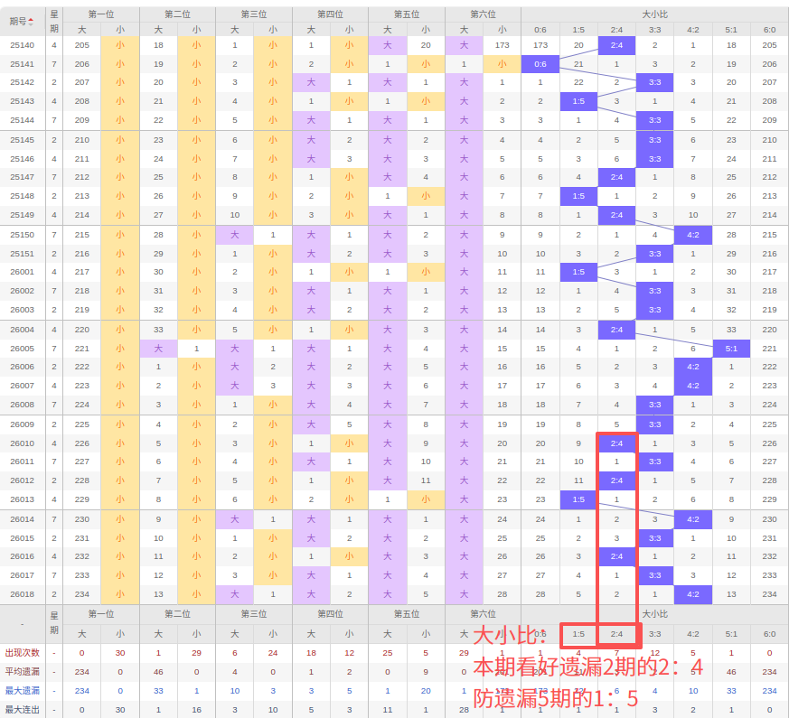 上期大小比:4:2,近10期大小比出现情况:3:3、2:4、3:3、2:4、1:5、4:2、3:3、2:4、3:3、4:2,最近10期出现4期3:3,出现2期4:2,出3期2:4,出现0期5:1,出现1期1:5,出现0期6:0,出现0期0:6,根据近10期规律本期看好遗漏2期出2:4,防遗漏5期的1:5,综上所述推荐大小比推荐:1:5,重点关注:2:4。