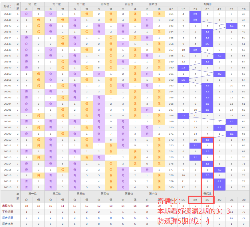 上期奇偶比:4:2,近10期奇偶比出现情况:45:1、3:3、2:4、3:3、2:4、3:3、4:2、3:3、4:2、4:2,最近10期出现4期3:3,出现3期4:2,出现2期2:4,出现1期5:1,出现0期1:5,出现0期6:0,出现0期0:6,根据近10期规律本期看好遗漏2期的3:3,防遗漏5期开的2:4,综上所述推荐奇偶比推荐:2:4,重点关注:3:3。