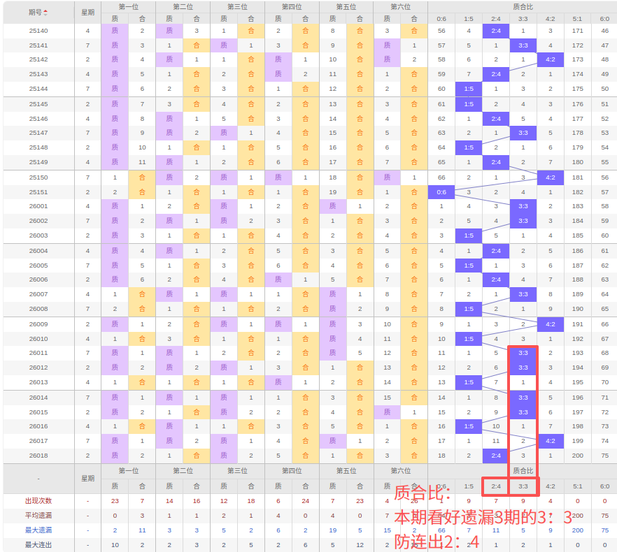 上期质合比:2:4,近10期质合比出现情况:4:2、1:5、3:3、3:3、1:5、3:3、3:3、1:5、4:2、2:4,最近10期出4期3:3,出现2期4:2,出现1期2:4,出现0期5:1,出现3期1:5,出现0期6:0,出现0期0:6,根据近10期规律本期看好遗漏3期的3:3,防连出的2:4,综上所述推荐质合比推荐:2:4,重点关注:3:3。