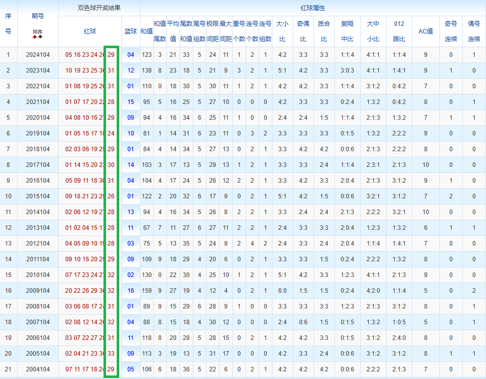 往年同期中选取出现次数靠前的数作为我们的分析对象,其数据有:29 23 17等