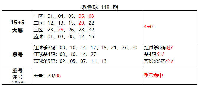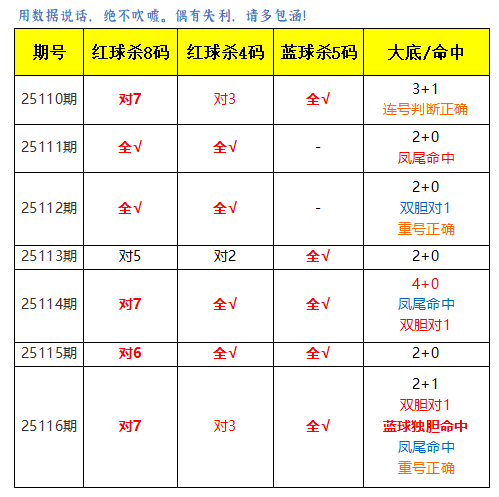 上期红球杀8码对7,免费文章杀4码全对,蓝球杀5码全对,目前连续5期蓝球杀号全对。重号命中,大底命中4+0,本期再接再厉!
