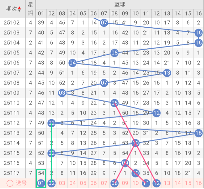 蓝球推荐关注号码:01、02、08、11、12