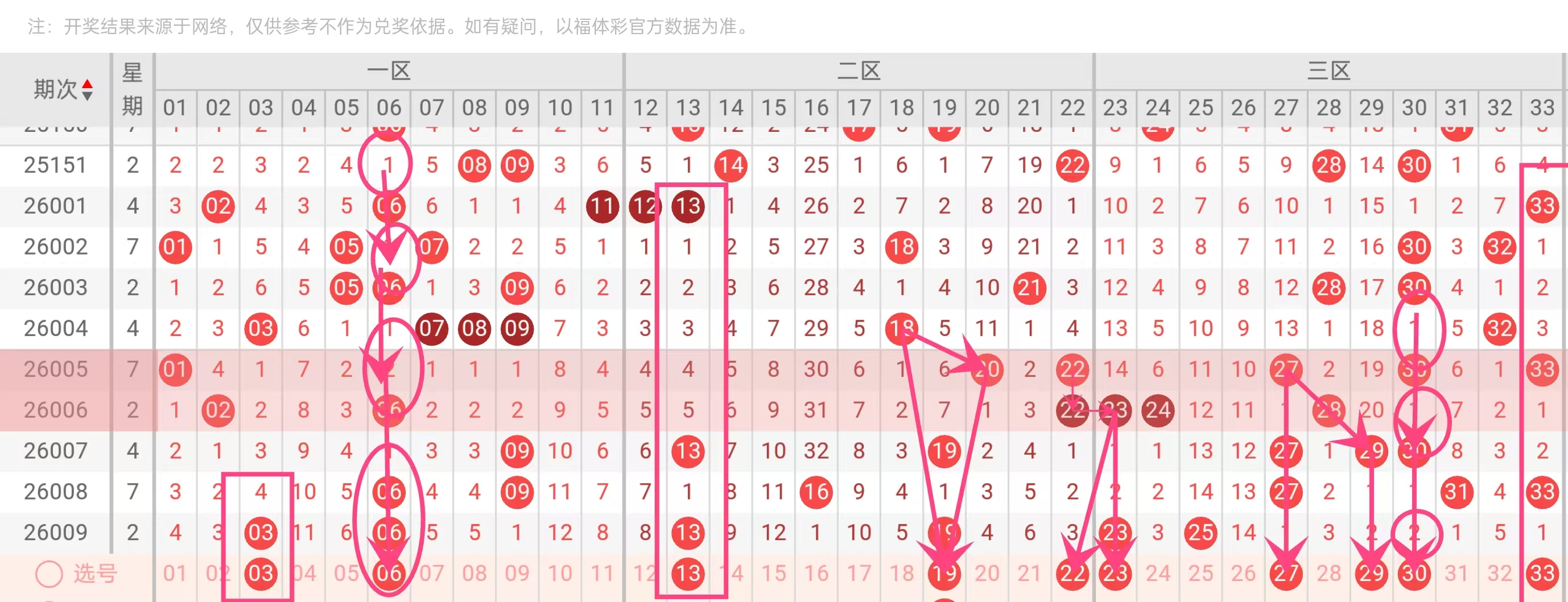 区间分布:近期一区(01–11)出号较少,二区(12–22)和三区(23–33)较活跃。
