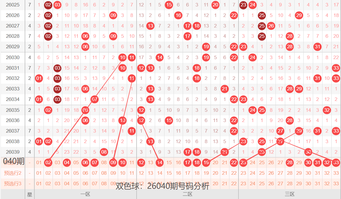 先介绍下上期开奖号码的基本情况,红球奇偶比:3:3,区间比:1:3:2,012路比:3:1:2,通过上期号码简单介绍,分享下26040期号码球个人认为的出号可能,供大家参考!