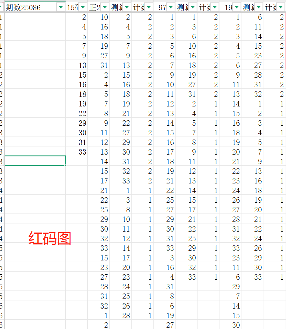 得出一组红码数据就是:2 4 5 7 9 13 15 16 18 19 22 29 30 31 33