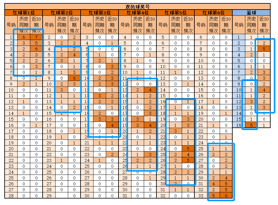 蓝球,历史同期频次最多的为16;近30期,频次最多的为3,明显特征是1路优势;推荐重点3-7-8-10-12-13-16。
