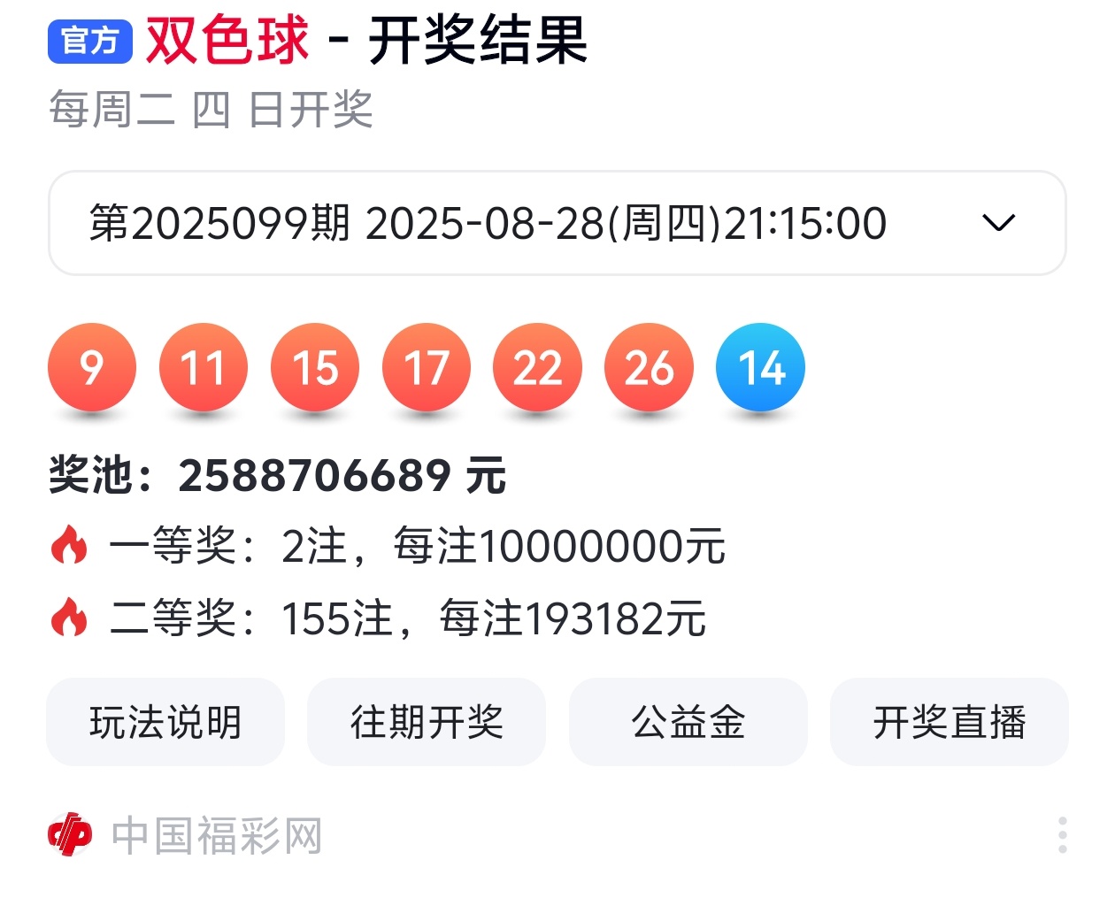 下面是我对2025100期福彩双色球的分析和预判,希望通过我的分析能让大家今晚大红!福彩双色球上期开奖号码如下图: