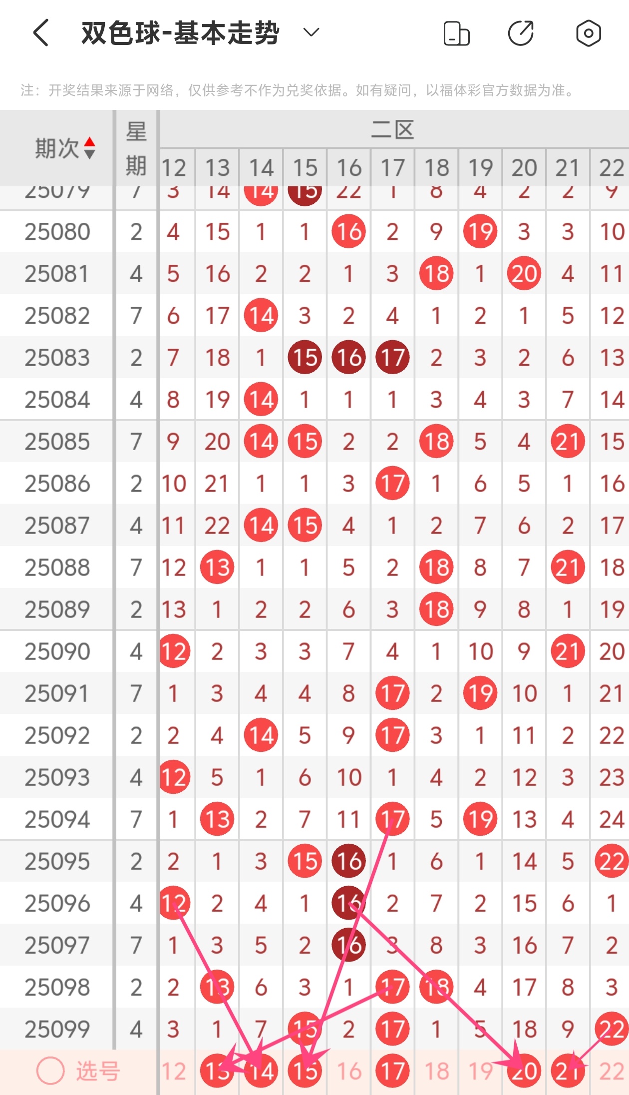 上期第二区间开出15 17 22,本期我们可以从上面走势图中看到选号的思路,13为斜连走势,14为斜连走势,15为斜连走势,20为斜连走势,21为分边走势,综合以上分析本期第二区间推荐13 14 15 17 20 21