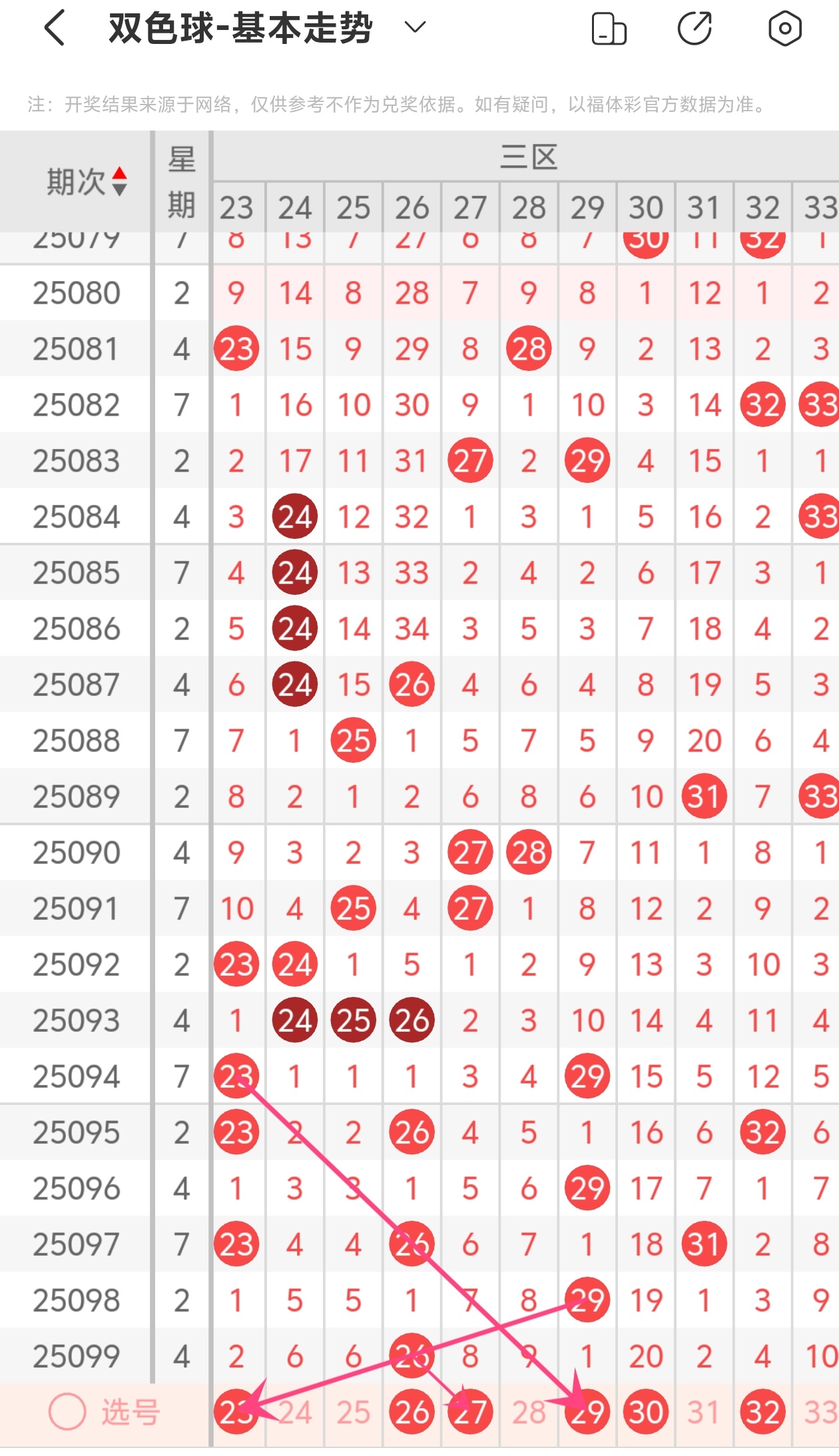 上期第三区间开出26,本期我们可以从上面走势图中看到选号的思路,23为斜连走势,27为分边走势,29为斜连走势,综合以上分析本期第三区间推荐23 26 27 29 30 32