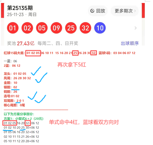 先回顾上期开奖号码:01 02 05 09 25 32—10,上期大底命中01 02 05 25 32。连续两期拿下5红,蓝球主看双方向对!!