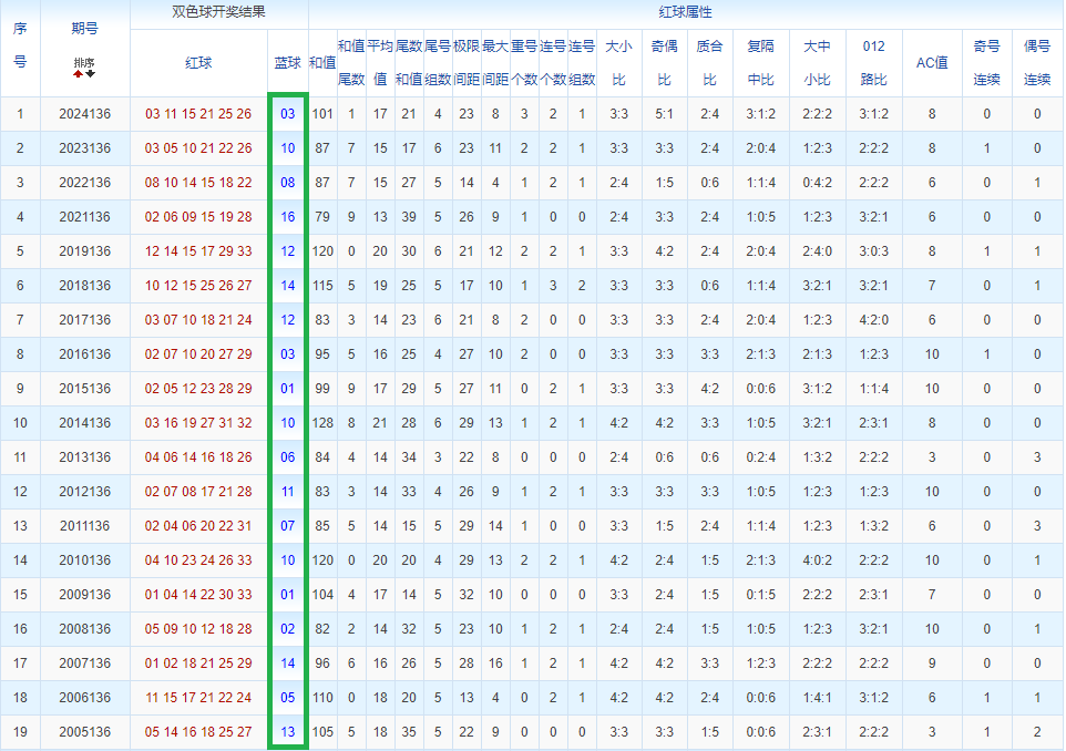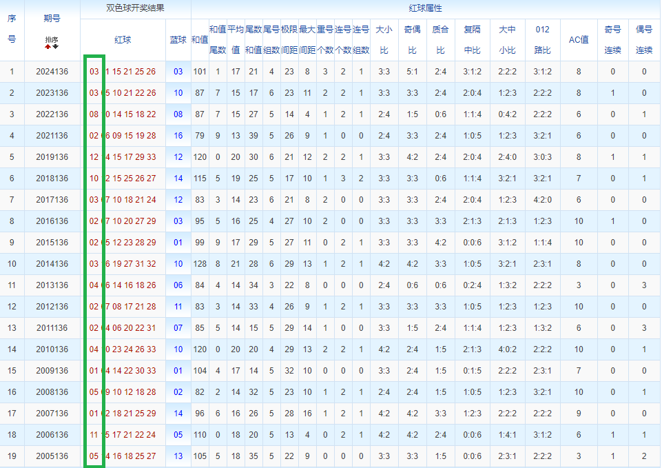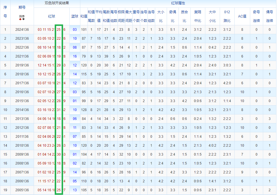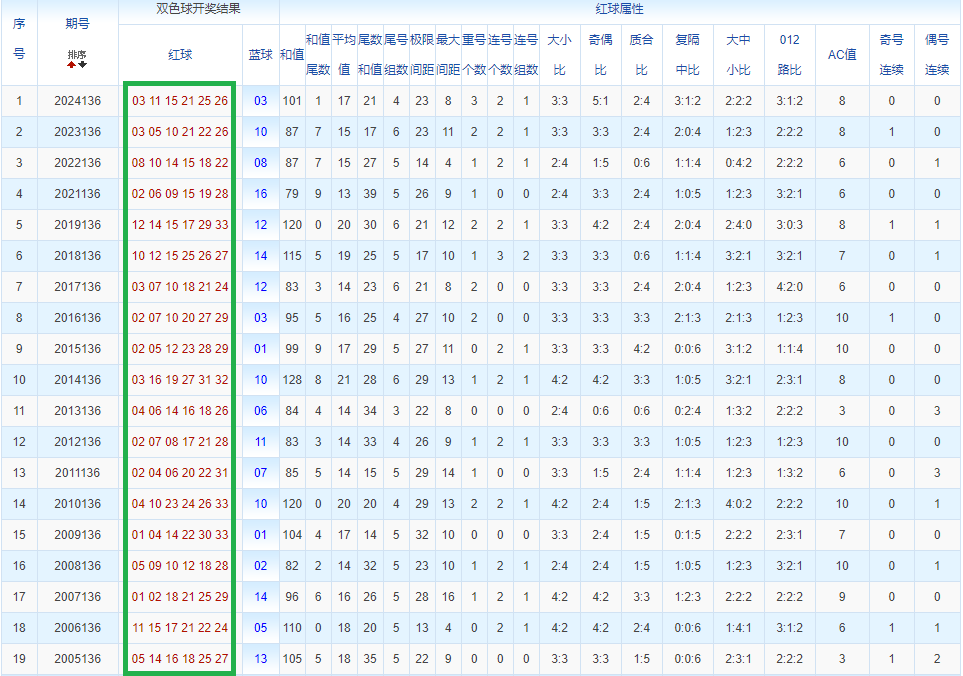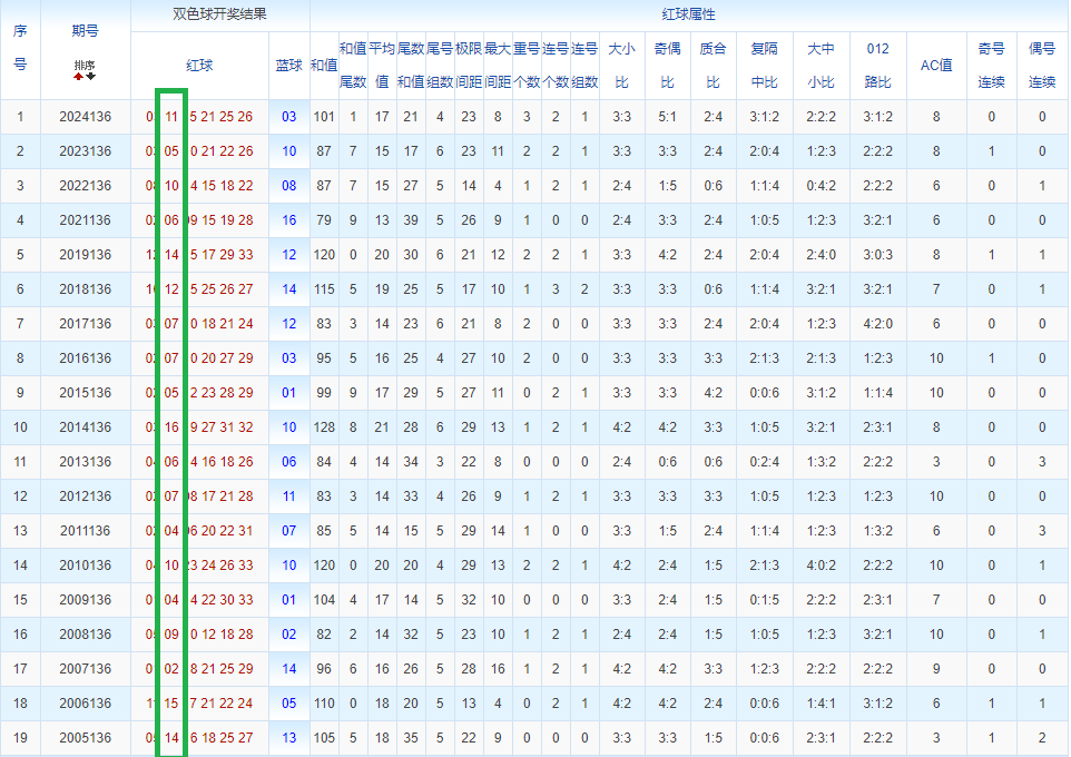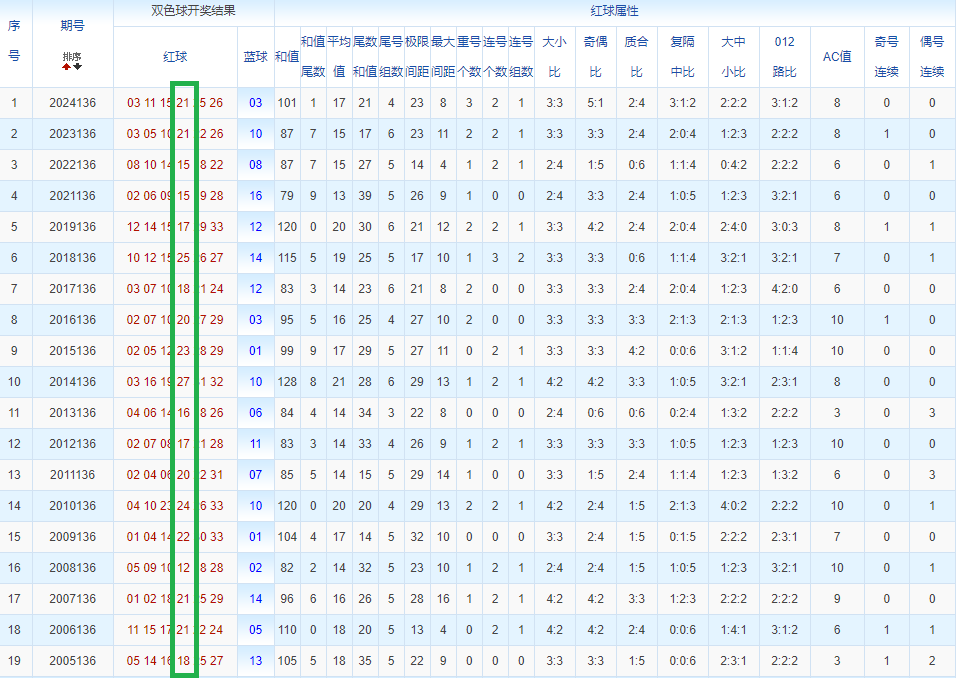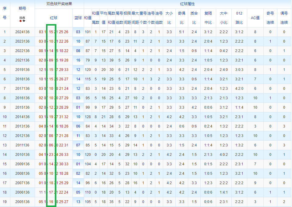 通过观察,我发现双色球往年同期的开奖数据与本期号码之间存在显著关联。具体来说,在红球中,从第一位至第六位,通常会有约4个位置上的数字与往年同期相同位置的号码一致;而蓝球号码中,也有多期开奖结果直接包含了往年同期的数字。因此,我们可以借助往年同期各位置上的号码,作为分析本期开奖情况的重要依据。在此基础上,还可结合往年同期的其他相关条件,进行综合性的号码组合推荐。