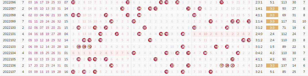 上期奇偶比为5:1,奇数活跃,近10期奇偶比为30:30,奇偶红球持平,本期预计奇数逐渐热出,关注奇偶比4:2。