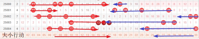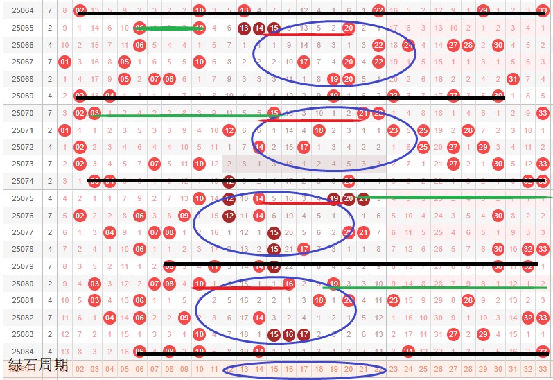 如图所示:体现的是3个局部走势的发展周期,圆圈为密集处的填空,本期定性为新局部走势2期,真实目的空间填蛋跨期,预估蛋跨12-22,在2区,绿色线在3区。代表本期依然小号布局为主,主力在2区出号,关键看24-33出几枚,就首尾制约来说本期压缩处理小跨。