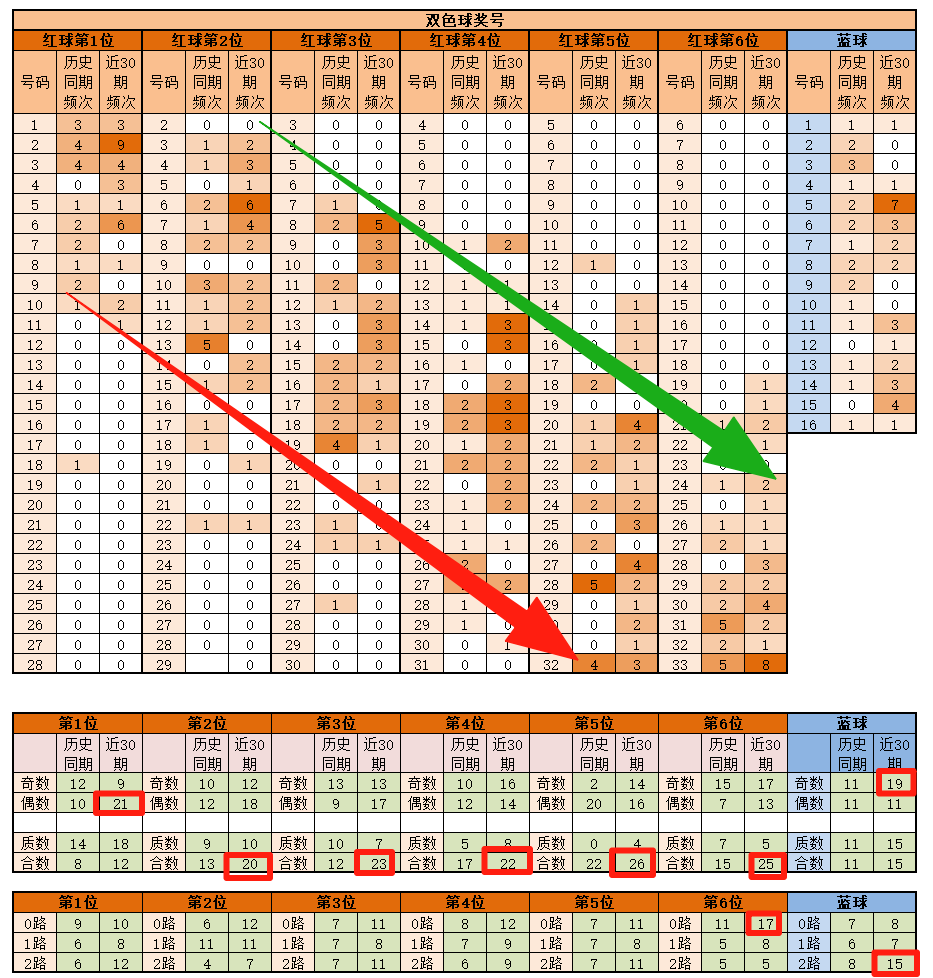 第6位,基本在21-33之间,历史同期频次最多的为31-33;近30期,频次最多的为33,明显特征是合数和0路优势;推荐重点28-30-33。