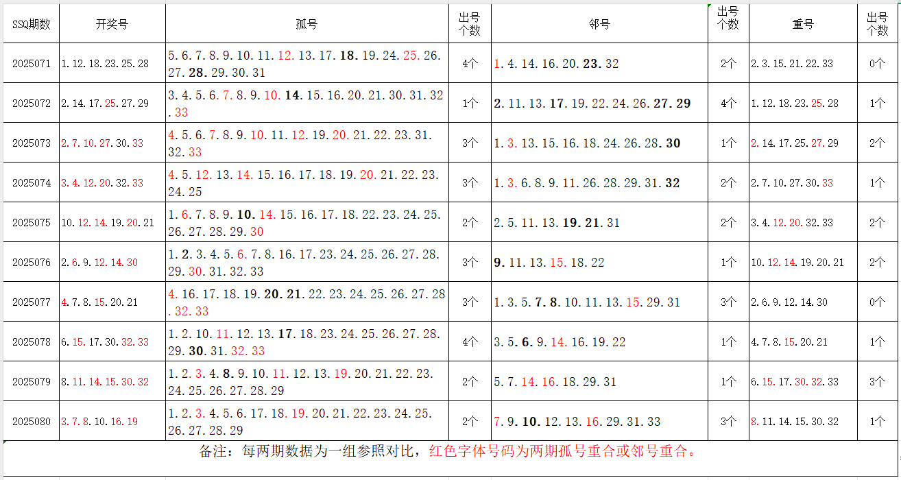 如图,以近两期数据为一组,进行对比分析。相同的孤号、邻号,可能在下期出1-4个左右。上期孤号开出2个,邻号开出1个,重号3个。本期参考孤号:1.5.12.13.14.21.22.23.24.25.26.27.28.29.30.31.32.33;邻号:2.4.6.9.11.15.17.18.20。孤、邻号重合号码精选:***(会员专区可见)。个人分析,仅供参考。