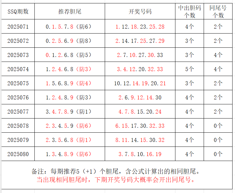 如图,每期推荐胆尾中出1-4个。上期推荐胆尾中出4尾4码!推荐胆尾是按照公式计算的顺序,不定位红球号码的顺序。本期推荐胆尾:1尾/9尾/0尾/5尾/6尾 。加推重点胆尾:***(会员专区可见)。推荐胆码号码:***(会员专区可见)。个人分析,仅供参考。