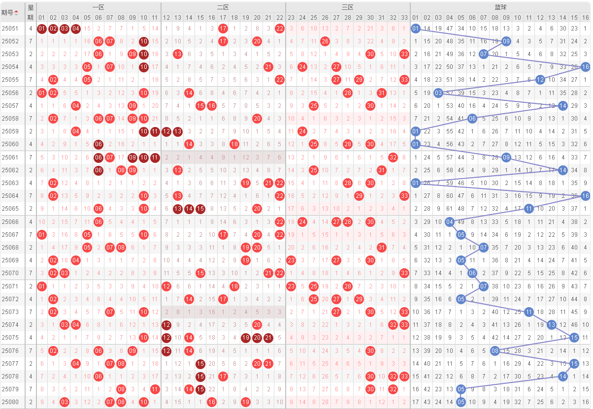 双色球区间比走势:上期区间比:4:2:0,比例失衡;