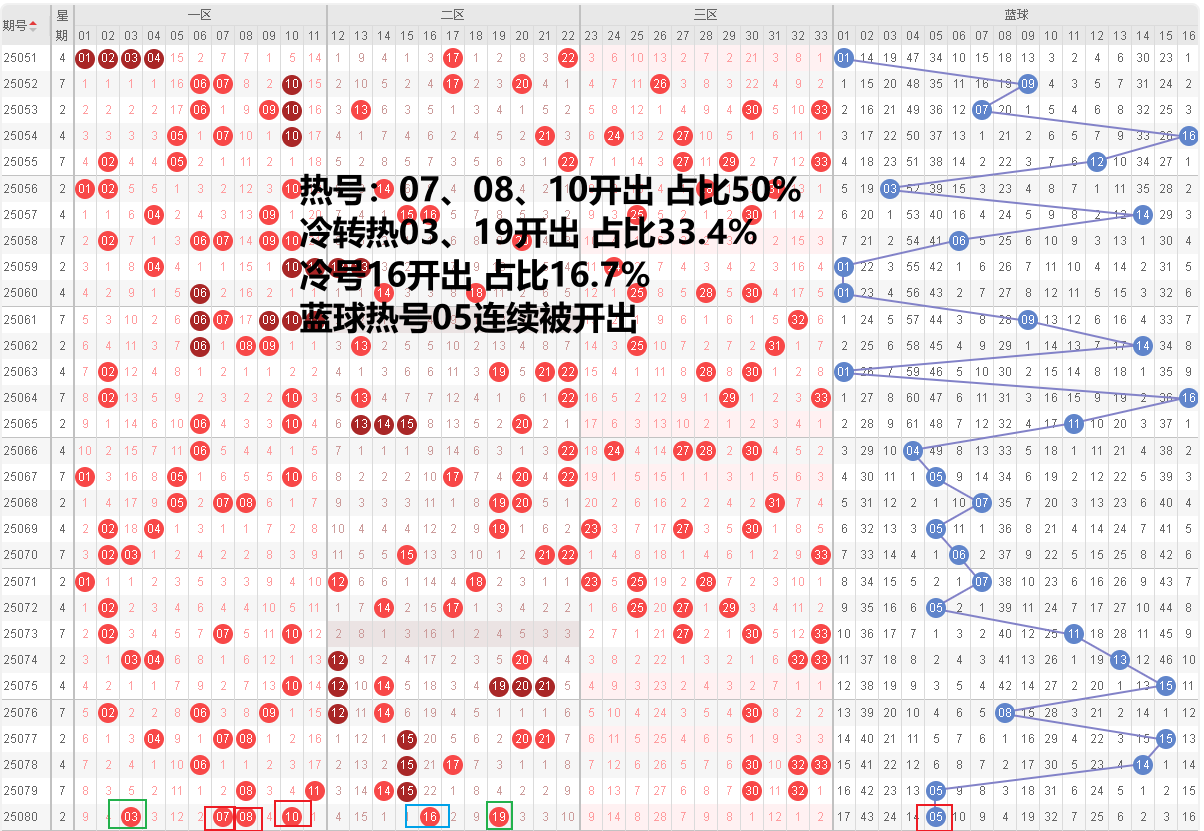 双色球第25078期选号分析基于我们前面列出来的最近十期的历史数据以及基本走势,接下来我们依然按照冷热号、和值、奇偶比、跨度、区间比等多维度进行综合分析。