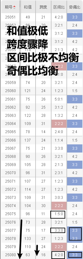 双色球和值走势:上期和值63,在100以下,数值非常低;