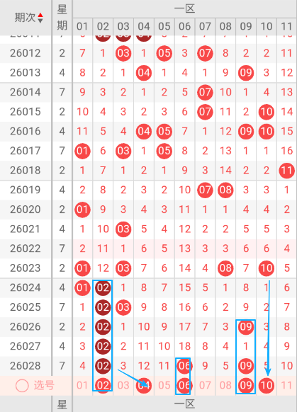 - 2:2:2:三区均衡出号,双色球中出概率最高的区间比