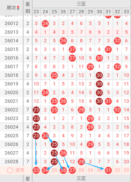根据走势图可以看出当前区,019期开出30一个号码球 ,020期开出24.30二个号码球 ,021期开出25.26.30.31四个号码球 ,022期开出23.25.28.32四个号码球 ,023期开出23.29二个号码球 ,024期开出23.29二个号码球 ,025期开出23.24二个号码球 , 026期开出25.29二个号码球 ,027期开出25.26二个号码球 ,028期开出25.28二个号码球 ,按照如此规律判断本期当前区可能开出1单或1单1双。我们看下当前区上期开出25重叠号,那么本期当前区要定重叠号的情况下可关注28码球。再看下当前区上期开出25斜连号,当期选号得留意27斜连号。本区重点关注23.24.26.27.31