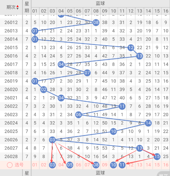 根据走势图近10期的走势看,蓝球在14期开出01蓝球之后,2大5小1大1小2大1小2大,再看下近10期的蓝球热码有回补的趋势,这种趋势规律本期判断极有可能开大号,本期防蓝球11大号,蓝球本期重点关注03,05,08,10,11