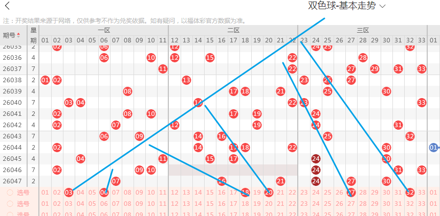8区间断层法:将红球分为01-11、12-22、23-33三区,找出近期出号最少之“断层”区间,以上期该区间最大号减3为该区核心胆码。