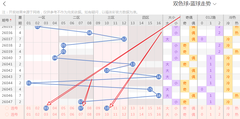 第二步:定胆精选 在剩余的号码中,再进行精挑细选。通过分析奇偶、大小、012路等规律,锁定1-2个最心仪的号码作为核心胆码。 取近5期蓝球之和,除以5后四舍五入取整为基点,以基点±2之数为蓝球胆码备选。