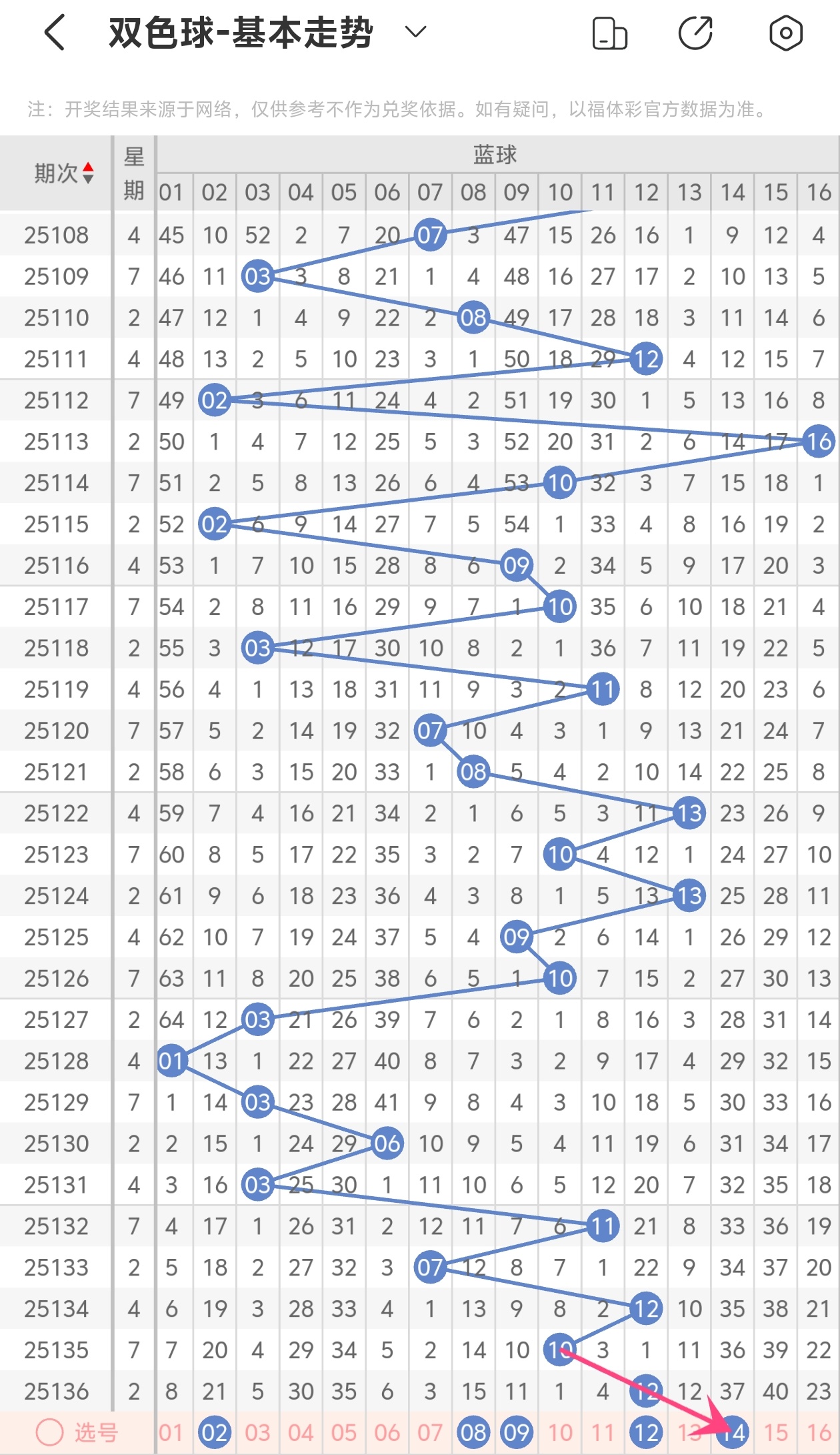 上期蓝球开出16,本期我们可以从上面走势图中看到选号的思路,12重码走势,14为斜连走势,综合以上分析本期蓝球推荐02 08 09 12 14
