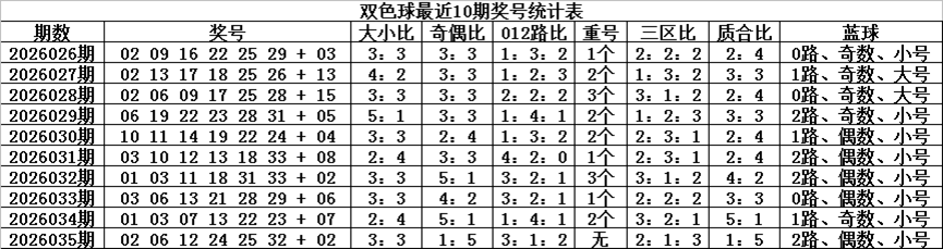 双色球第2026035期开出奖号为:02、06、12、24、25、32+02,其中红球号码奇偶比为1:5,大小比为3:3,012路比为3:1:2,和值为101,跨度为30,三区比为2:1:3,没有出现重复红球。蓝球开出偶数、小号、2路。