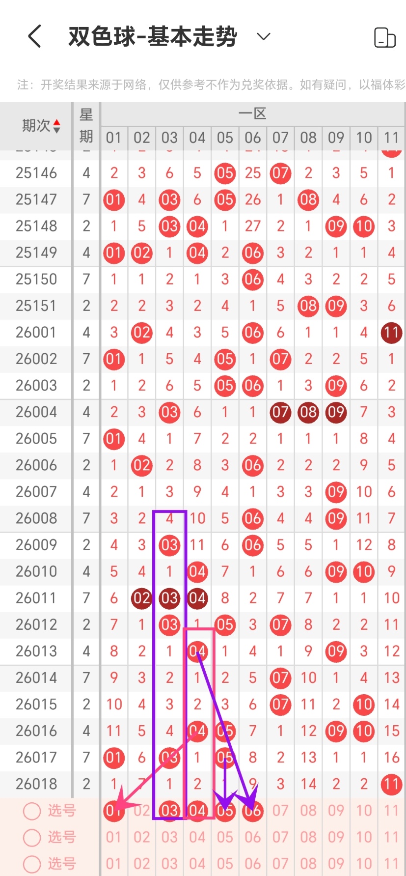 通过对同星期周四邻号出现数量规律进行统计分析,本期考虑出号1-3个,即03-04-05-06-08-09-10-11-26-28-29-31出号1-3个