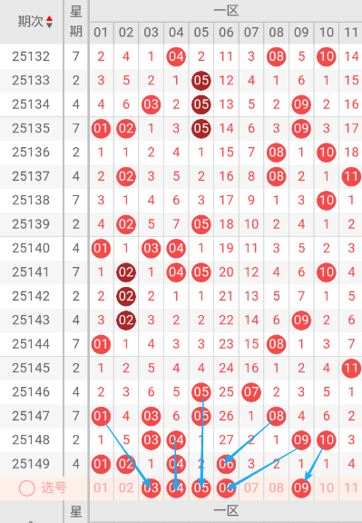 根据走势图可以看出当区段,140期开出01.03.04三个号码球 ,141期开出02.04.05.10四个号码球 ,142期开出02一个号码球 ,143期开出02.09二个号码球 ,144期开出01.08二个号码球 ,145期开出11一个号码球 ,146期开出05.07二个号码球 ,147期开出01.03.05.08四个号码球 ,148期开出03.04.09.10四个号码球 ,149期开出01.02.04.06四个号码球 ,按照如此规律本期当前区判断可能会开出1双或2双。我们看下当前区上期开出04重叠号,那么本期当前区要定重叠号的情况下可关注04号码球。再看下当前区段上期开出02.04斜连号,当期选号得留意05斜连号。建议重点关注03.04.05.06.09