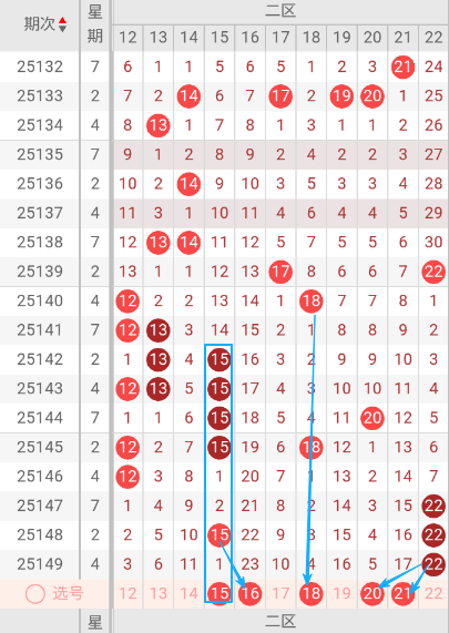 根据走势图可以看出当前区段,140期开出12.18二个号码球 ,141期开出12.13二个号码球 ,142期开出13.15二个号码球 ,143期开出12.13.15三个号码球 ,144期开出15.20二个号码球 ,145期开出12.15.18三个号码球 ,146期开出12一个号码球 ,147期开出22一个号码球 ,148期开出15.22二个号码球 ,149期开出22一个号码球 ,按照如此规律本期当前区可能开出1双1单。我们看下当前区上期开出22重叠号,那么本期当前区要定重叠号的情况下可关注22号码球。再看下当前区上期没有开出斜连号,当期选号得留意斜连21号码球。本区重点关注15.16.18.20.21