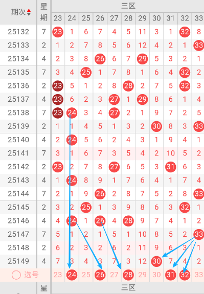 根据走势图可以看出当前区,140期开出24一个号码球 ,141期没有开出个号码球 ,142期开出03.27.31三个号码球 ,143期开出24一个号码球 ,144期开出26.33二个号码球 ,145期开出25.32二个号码球 ,146期开出24.26.28三个号码球 ,147期开出33一个号码球 ,148期没有开出号码球 ,149期开出30一个号码球 ,按照如此规律判断本期当前区可能开出2双或1双。我们看下当前区上期没有开出重叠号,那么本期当前区要定重叠号的情况下可关注30码球。再看下当前区上期没有开出斜连号,当期选号得留意31斜连号。本区重点关注24.26.28.31.32
