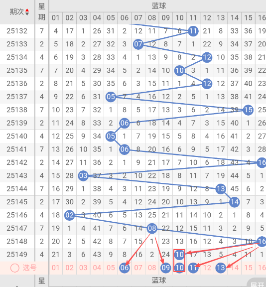 根据走势图近10期的走势看,蓝球在139期开出10蓝球之后,3小1大1小2大2小2大,再看下近10期的蓝球中冷码有回补的趋势,这种趋势规律本期判断极有可能开出小号,本期防蓝球14大号,蓝球本期重点关注06,09,10,11,13