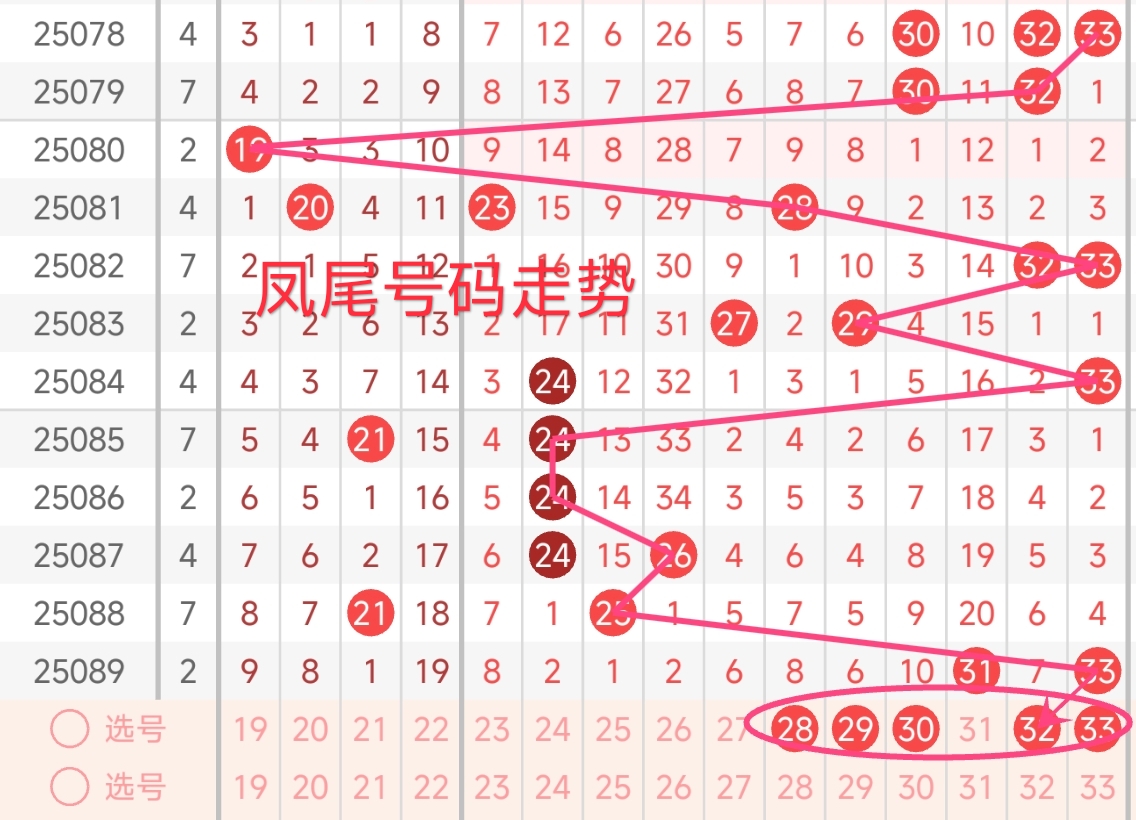上期凤尾号码为33,振幅上升了9点,开出了奇数号码。回顾近期凤尾号码,振幅波动较大。上期凤尾为33,近期凤尾号码主要集中在红三区之间波动。本期凤尾号码预计仍会在这个区间内选择,重点关注30、32、33。30在近期出现次数较少,有开出的可能性;32和33在上期和近期都有一定的表现,继续开出的概率也较大。 本期还需注意一些连续漏出的号码有望在本期热出。本期凤尾号码可重点关注28、29、30、32、33。