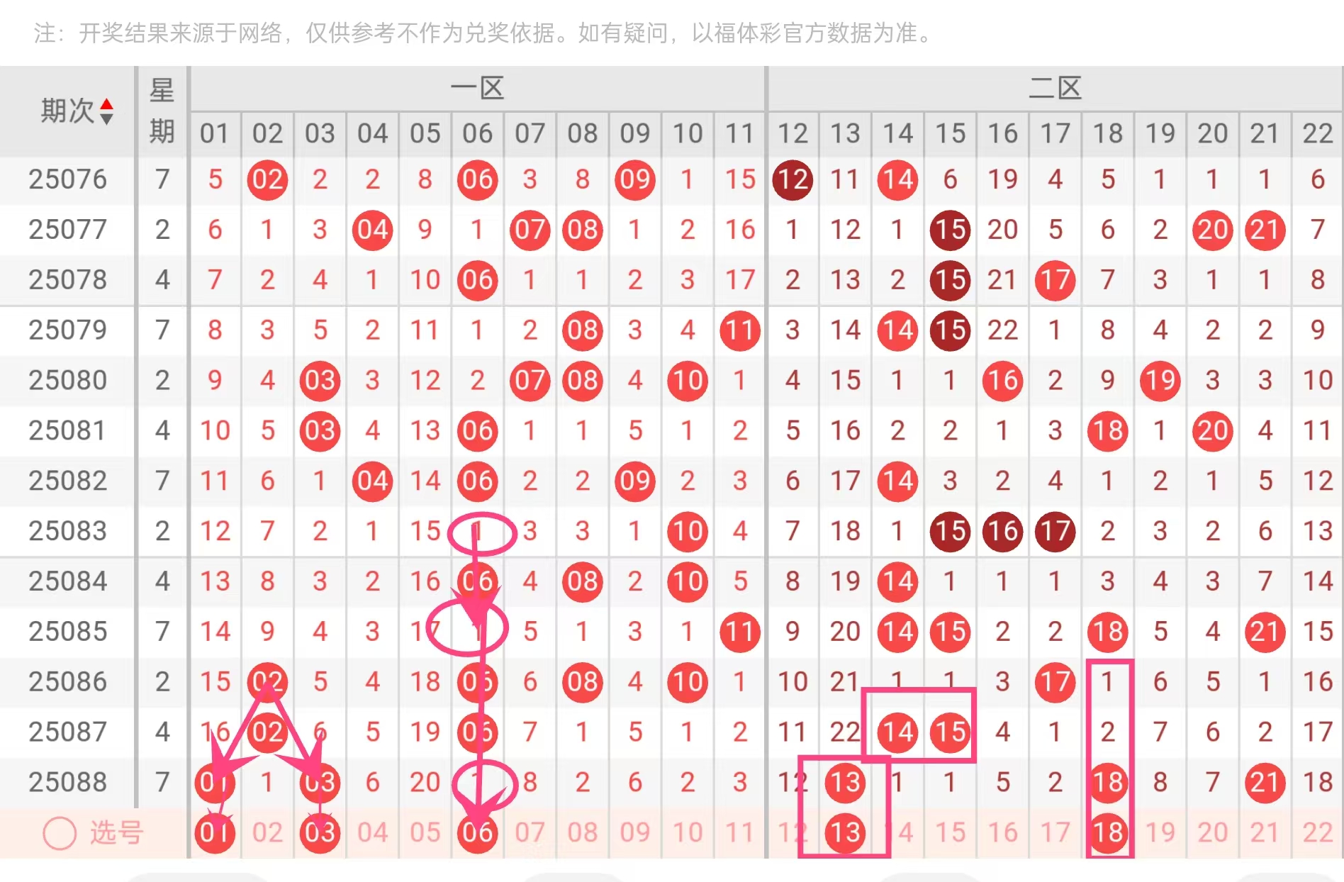 06:频率18次(红球第二高),遗漏值1(仅一期未出)。整体最热号码之一,历史表现稳定,容易回补。