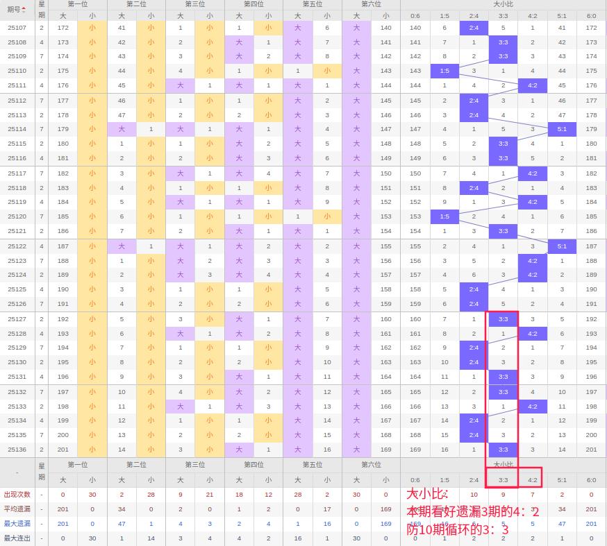 上期大小比:3:3,近10期大小比出现情况:3:3、4:2、2:4、2:4、3:3、3:3、4:2、2:4、2:4、3:3,最近10期出现4期3:3,出现2期4:2,出4期2:4,出现0期5:1,出现0期1:5,出现0期6:0,出现0期0:6,根据近10期规律本期看好遗漏3期的对称4:2,防连出3:3,综上所述推荐大小比推荐:3:3,重点关注:4:2。