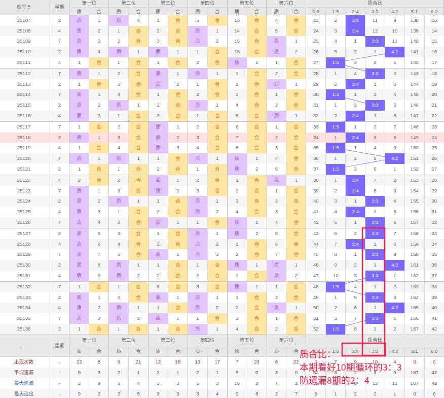 上期质合比:1:5,近10期质合比出现情况:3:3、2:4、3:3、4:2、3:3、1:5、3:3、4:2、3:3、1:5,最近10期出5期3:3,出现2期4:2,出现1期2:4,出现0期5:1,出现2期1:5,出现0期6:0,出现0期0:6,根据近10期规律本期看好10期循环的3:3,防遗漏8期的2:4,综上所述推荐质合比推荐:2:4,重点关注:3:3。