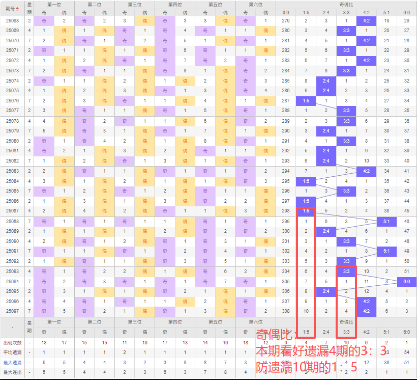 上期奇偶比:4:2,近10期奇偶比出现情况:5:1、2:4、3:3、5:1、3:3、3:3、6:0、2:4、4:2、4:2,最近10期出现4期3:3,出现2期4:2,出现2期2:4,出现2期5:1,出现0期1:5,出现1期6:0,出现0期0:6,根据近10期规律本期看好遗漏4期的3:3,防遗漏10期的1:5,综上所述推荐奇偶比推荐:1:5,重点关注:3:3。