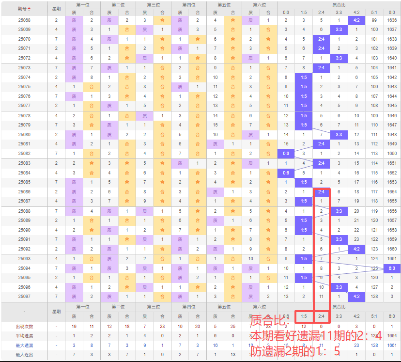 上期质合比:4:2,近10期质合比出现情况:3:3、1:5、1:5、3:3、4:2、1:5、6:0、1:5、3:3、4:2,最近10期出3期3:3,出现2期4:2,出现0期2:4,出现0期5:1,出现4期1:5,出现1期6:0,出现0期0:6,根据近10期规律本期看好遗漏11期的2:4,防遗漏2期的的1:5,综上所述推荐质合比推荐:1:5,重点关注:2:4。