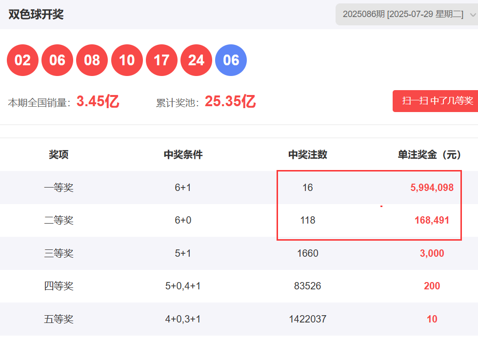 大家好,我是一起彩,作者九九锦锦鲤,今天是2025年7月31日星期四,今天是双色球游戏第25087开奖。那么首先我们回顾一下086期双色球一等奖开出16注,单注奖金599万,二等奖开出是118注,单注奖金16.8万
