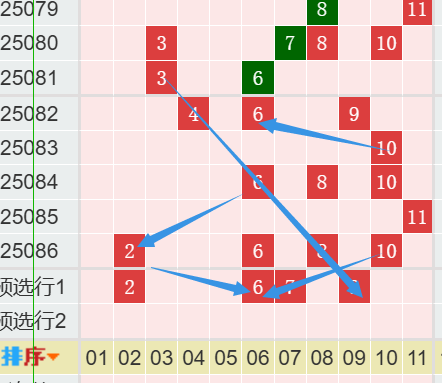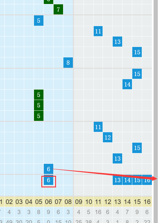 那么本期的蓝球我认为的话,06还是有重号的可能。那么篮球01~05,我建议大家本期不需要考虑,本期需要考虑的点一个是重号,一个是往大号的去发展一个趋势,大号的话,主要是集中在13,14,15,16,那么看好的蓝一个是06,一个是隔期号13,一个是14.15.16