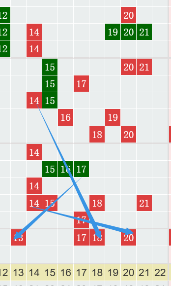 那么二分区上一期只开了一枚17号,这个17号大家从走势图上可以观察到,比较隐蔽。这个号码呢,能选到的人还是非常少的,那么这个号码究竟是如何得来的?还是要观察这个15.18.的这个结构,通过观察15.18.结构,我们可以发现15.17.15.17有结构图形关系。那么二分区的话,嗯,我给大家关注的几个点,一个是13号,这个号码是一个冷号,但是呢,这个上这个号码呢,它有出号的一些趋势,首先呢,这个号码呢,它是一枚斜连号码。也是一枚冷号。这个号码13号,我觉得在二分区,分量还是非常重的,那么其他的号码你像18192021。特别是17~24之间。我们该去如何选择1啊,其实的话要关注2021