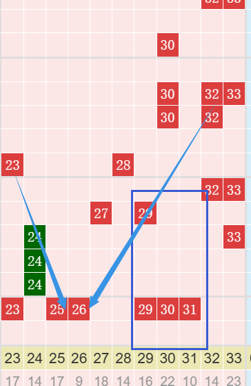 那么我们再看一下,三分区的号码本期的话是要重点有组合号码产生是所有三个区间。087期的话是一个比较重要的一个区间,那么上一期连开三期24号,那么首先我们要关注边号23,那么通过23的组合,我们会发现。23也有连号的情况,23.26.27. 23.26.29等等都是23的组合